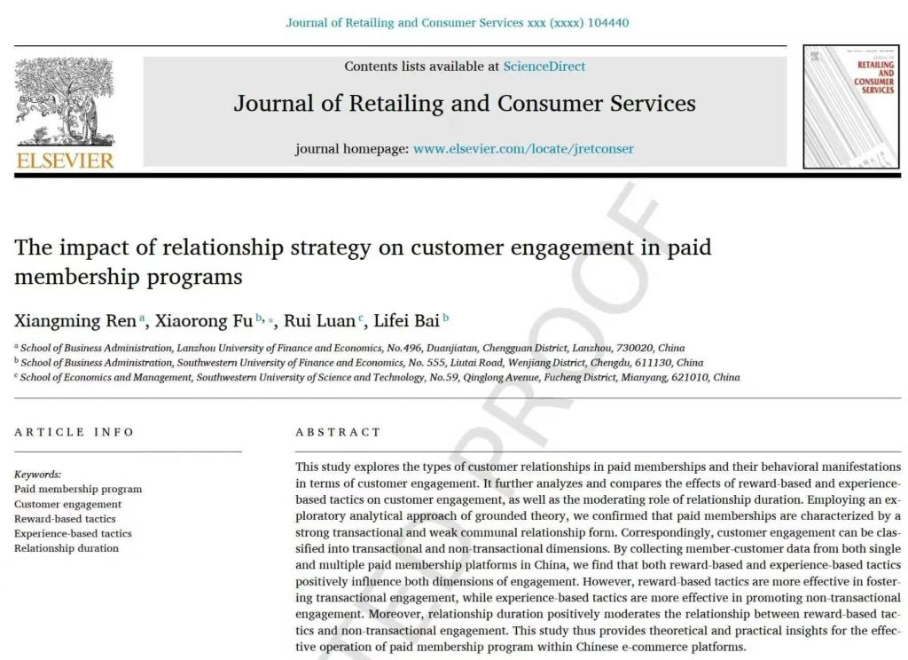 2. Ren, X., Fu, X., Luan, R., & Bai, L. (2025). The impact of relationship strategy on customer engagement in paid membership programs. Journal of Retailing and Consumer Services, 87, 104440.