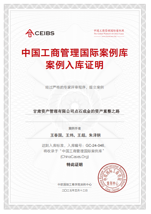 由我院教师王春国团队开发的管理案例《甘肃资产管理有限公司点石成金的资产重整之路》,经过严格评审,被“中国工商管理国际案例库(ChinaCases.Org)”收录(入库编号为GC-24-046)。
