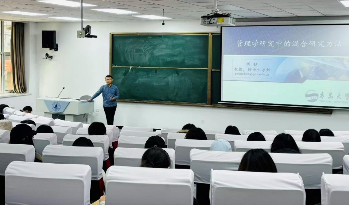 2025年12月23日下午,青岛大学商学院周键教授、张金涛副教授应邀为学院师生作《管理学研究中多研究方法的运用》《国际期刊论文发表经验分享》主题讲座,学院师生代表聆听讲座。