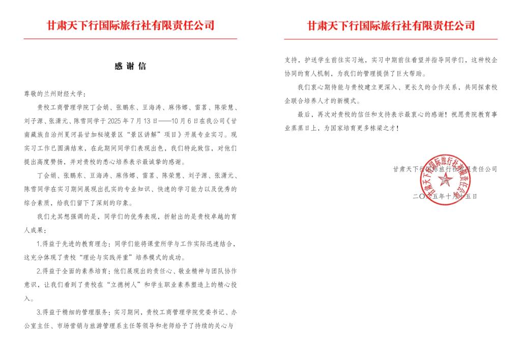 甘肃天下行国际旅行社在来信中特别强调,我院实习生在实习期间态度认真、积极主动、业务上手快、服务意识强,不仅有效支援了景区旺季的运营服务工作,其优异表现更是成为了景区一道亮丽的风景线,为提升游客体验和景区美誉度做出了积极贡献。旅行社特向学院发来表扬信并授予锦旗,以表彰学子们的出色表现,并表达对学院人才培养质量的高度赞誉和对未来持续深化合作的强烈愿望。